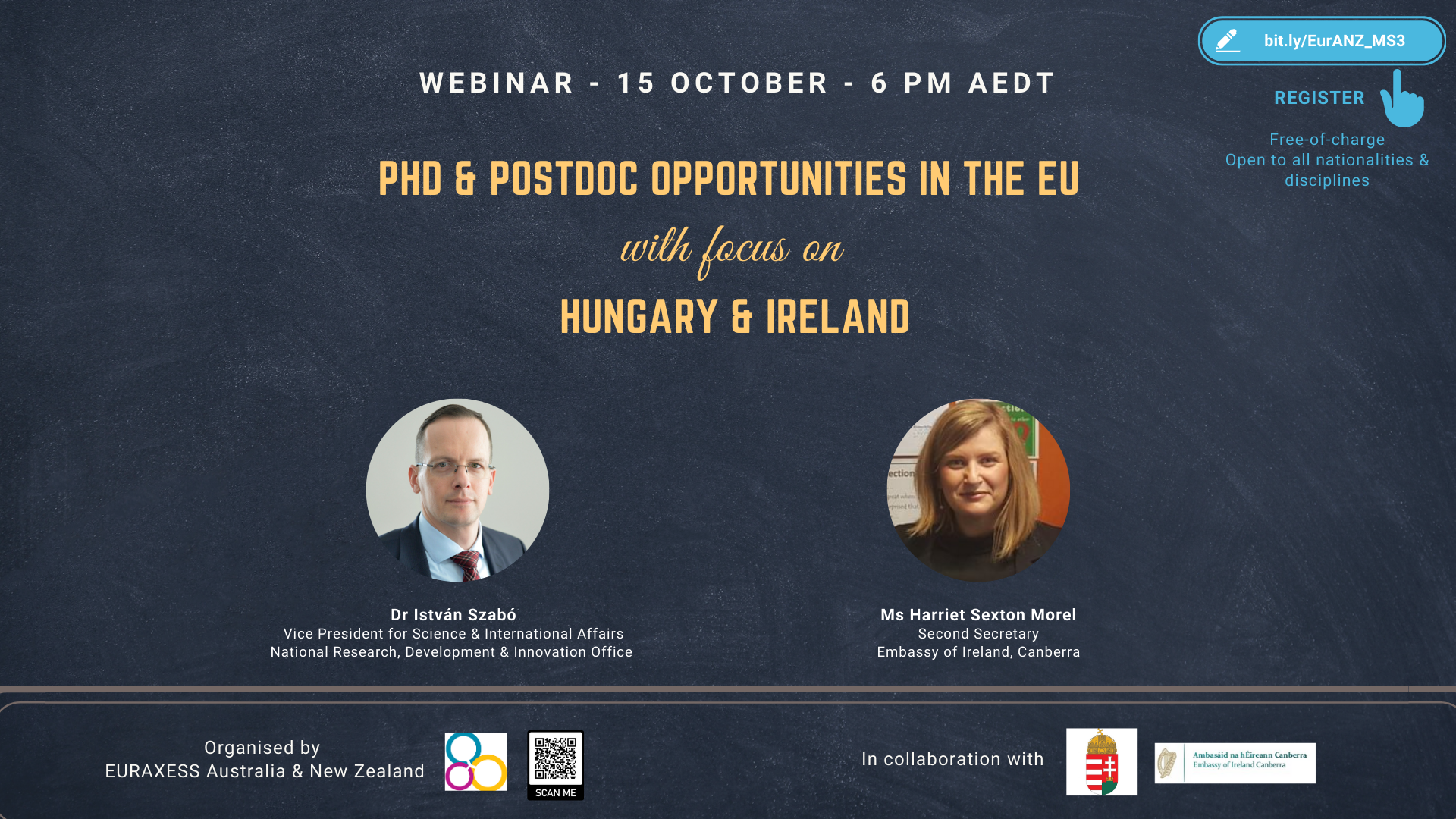EURAXESS is the European Commission’s networking tool supporting researchers working outside of Europe who wish to connect or stay connected with Europe. In a series of webinars, the EURAXESS Office in Sydney offers the opportunity to learn about research policies, collaboration opportunities and funding in various EU member states, providing valuable information for any person considering a PhD or post-doc research programme in Europe. The next webinar on 15 October 2020 will focus on Hungary & Ireland.